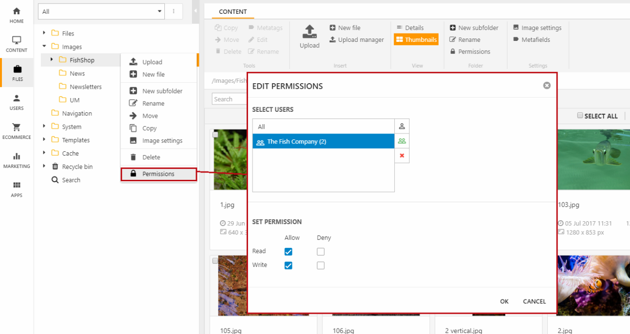 Permissions can also be set in the file manager, by right clicking a folder in the files tree (Figure 9.1) and clicking permissions.