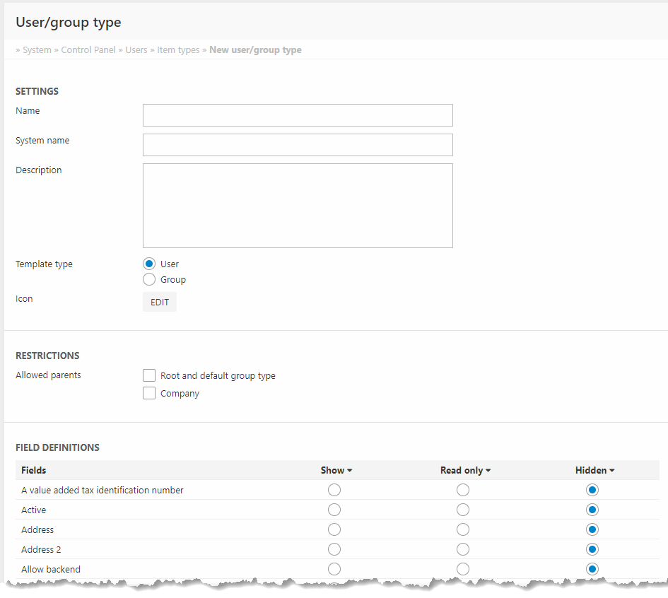 This opens the user/group type definition view which is used to configure the user or user group type (Figure 2.2).