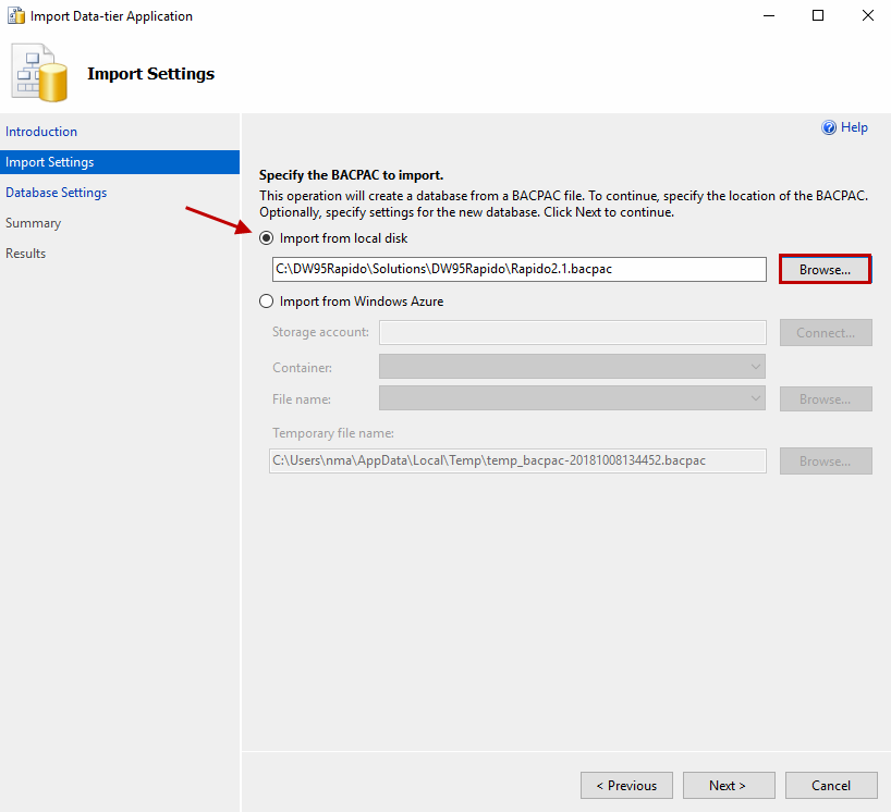 If not already selected, select Import from local disk and click Browse and locate your .bacpac-file (Figure 4.1). Then, click Next.