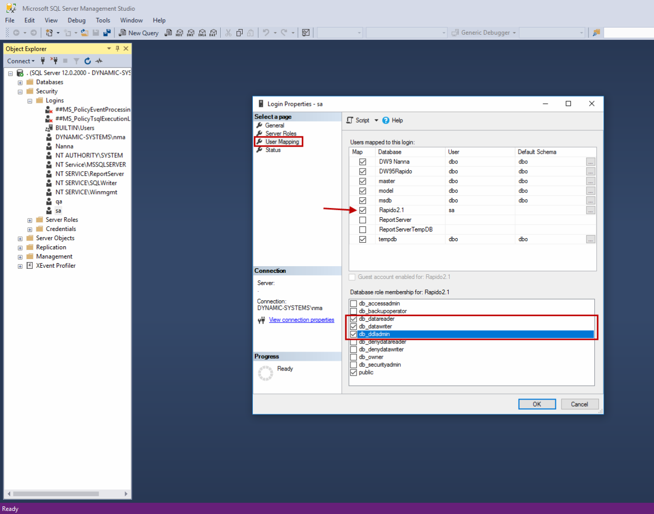 - Check the db_datareader, db_datawriter and db_ddladmin roles for the user