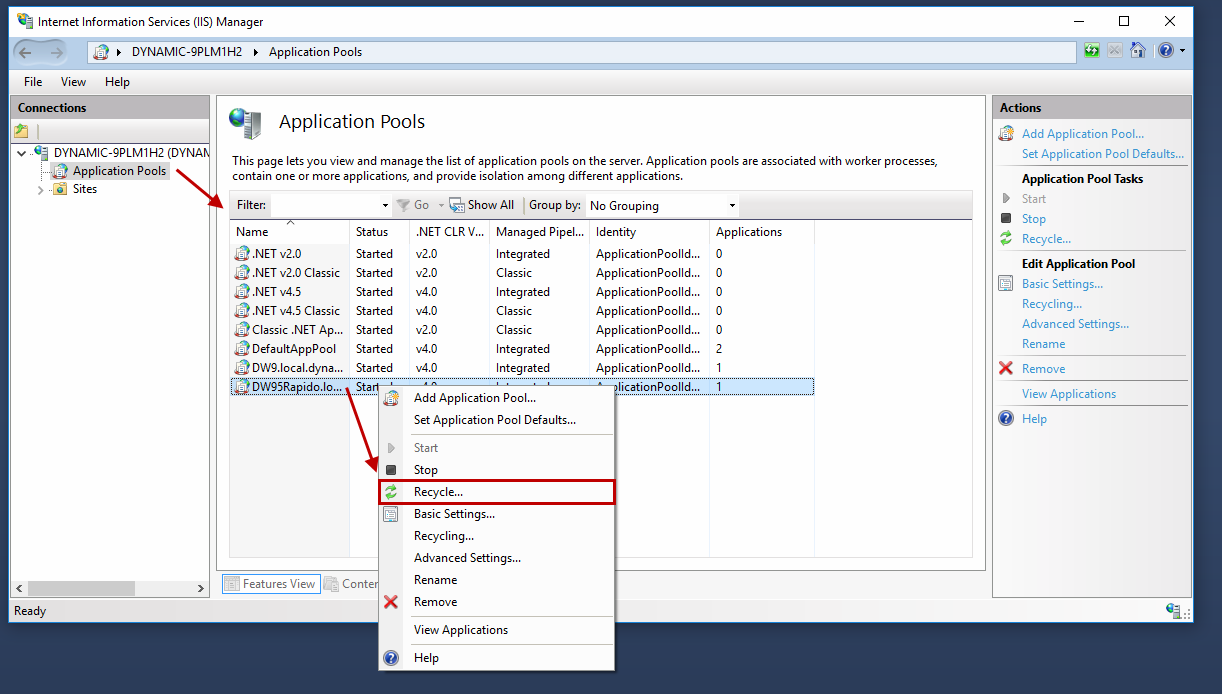 You should now recycle the application pool for the site in IIS Manager (Figure 6.2) – occasionally the SQL user credentials are cached and will prevent you from connecting properly to the database.