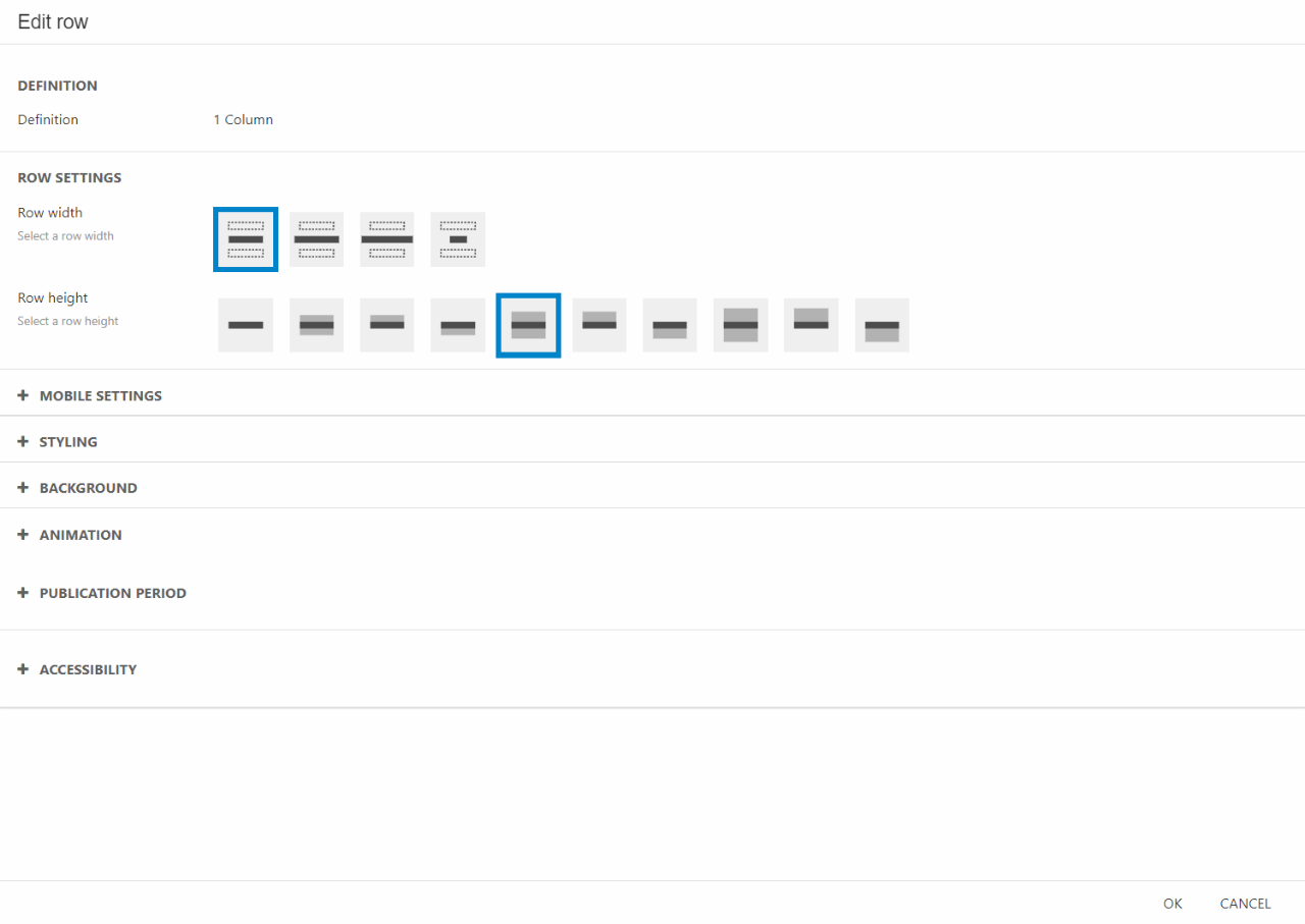 • Row height – Row height controls how much free space there will be above and/or beneath a row. “Auto” means the mobile settings will inherit the settings from the desktop settings.