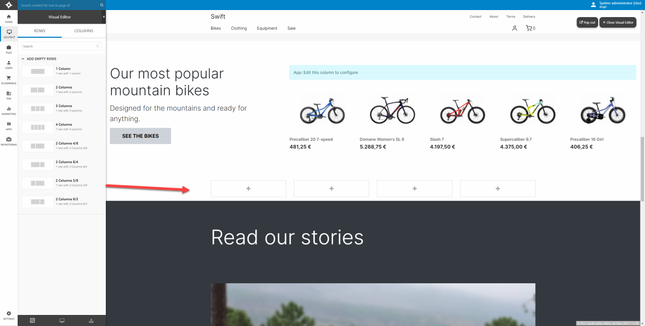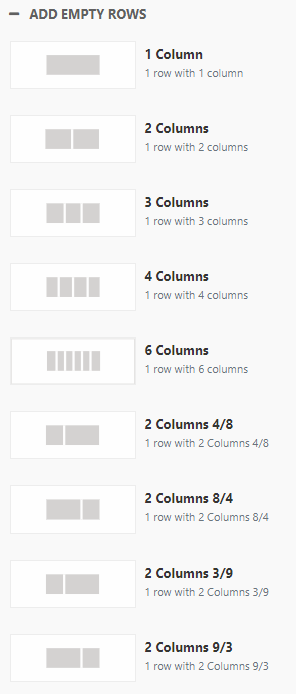 You can use rows to decide the amount and layout of the columns before content is added. Rows can consist of multiple columns depending on how you want your content to be showed. Below you can see which row types you can choose between, when you are about to place and structure your content.