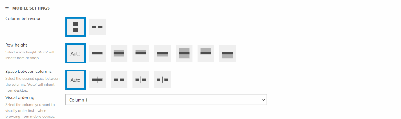 The Mobile settings section is for you to control how the row should behave when shown on smaller screens such as mobiles. These can either inherit behavior from the Row settings section or individually configured.