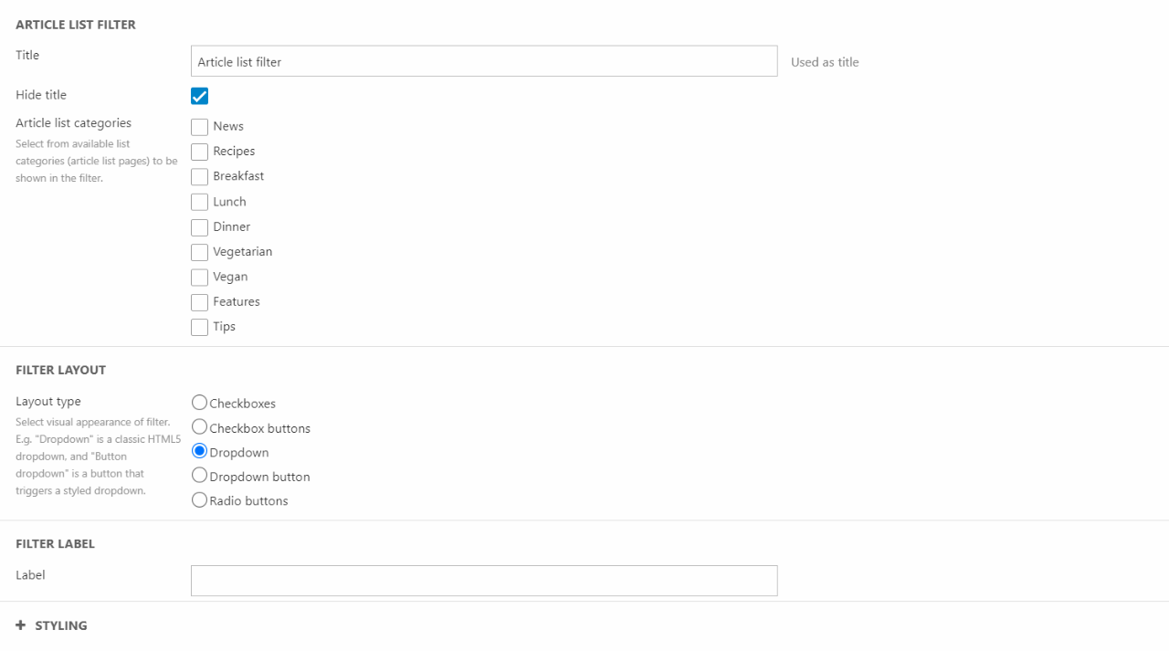 The article list filter can be used to filter articles displayed in an article list column. Say you are displaying all articles in a article list page containing most of your articles, but a user might only be interested in articles placed in the subcategory called “News”.