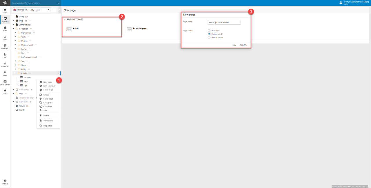 - Locate the wanted category in the content tree – in this case the article list page called User stories. Right click on it. In the drop-down menu click New page.