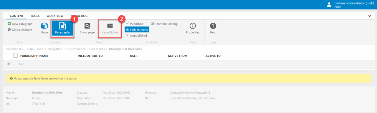 After saving, it’s time to create the content on your page – this is done using the Visual Editor like on any other page: