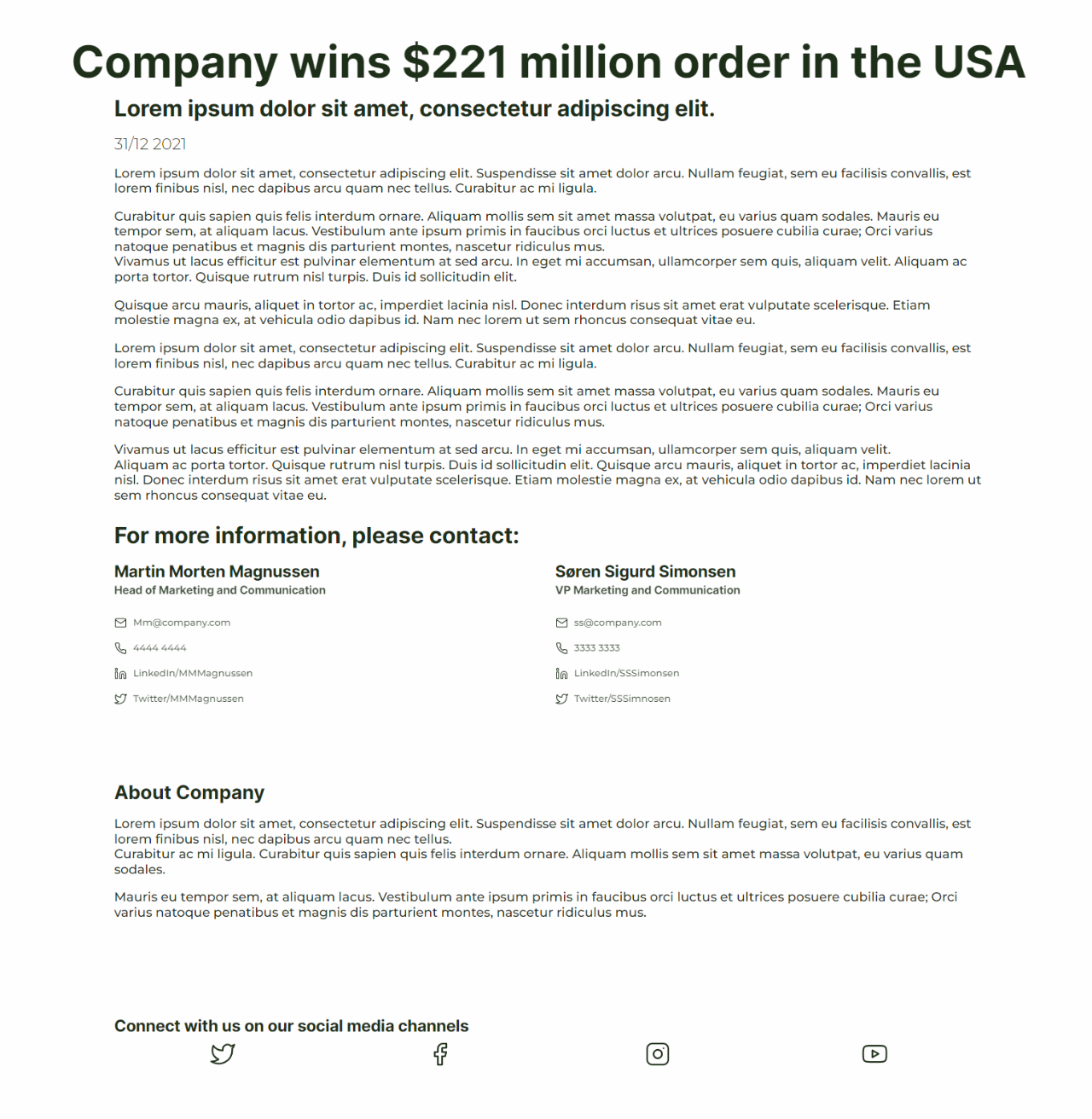 Articles can also be used as a press release tools. Press releases can vary in designs, with or without images. In this example we’ve made a relatively simple press release consisting of a section header and text columns as the main part of the page. At the bottom we have a “footer” with some general information about the company and links to social media pages.