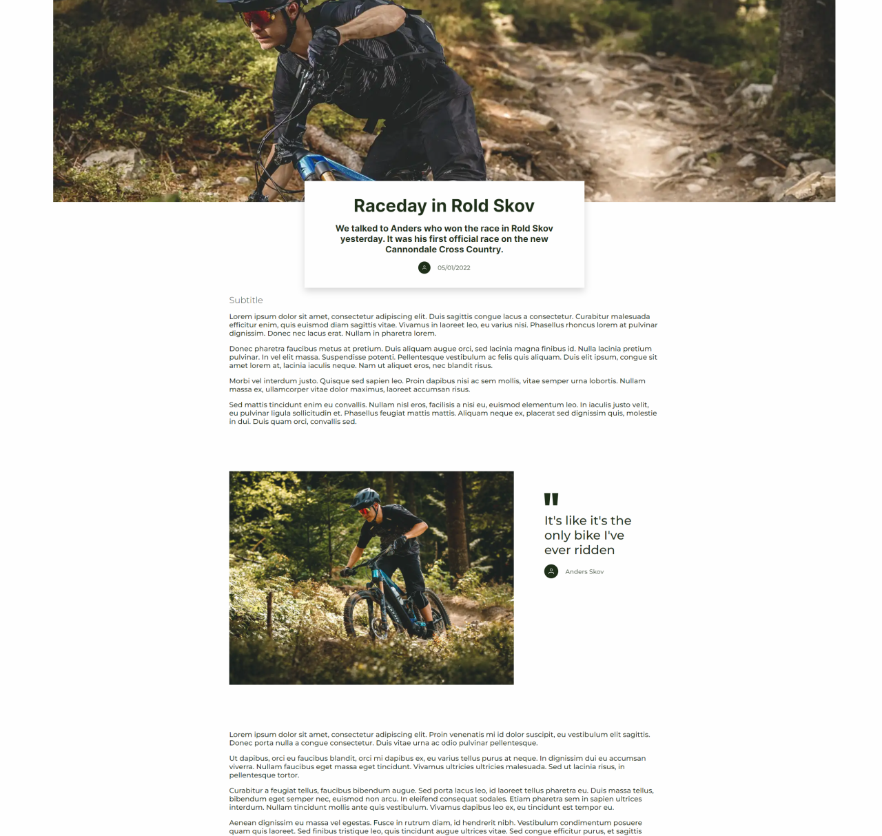 The content on article pages can be tricky to design properly. We’ve made some different examples to show how the articles can be used and how they are built. You can try to copy the example articles 1:1 or use elements from different examples to create the expression you want for your own articles.
