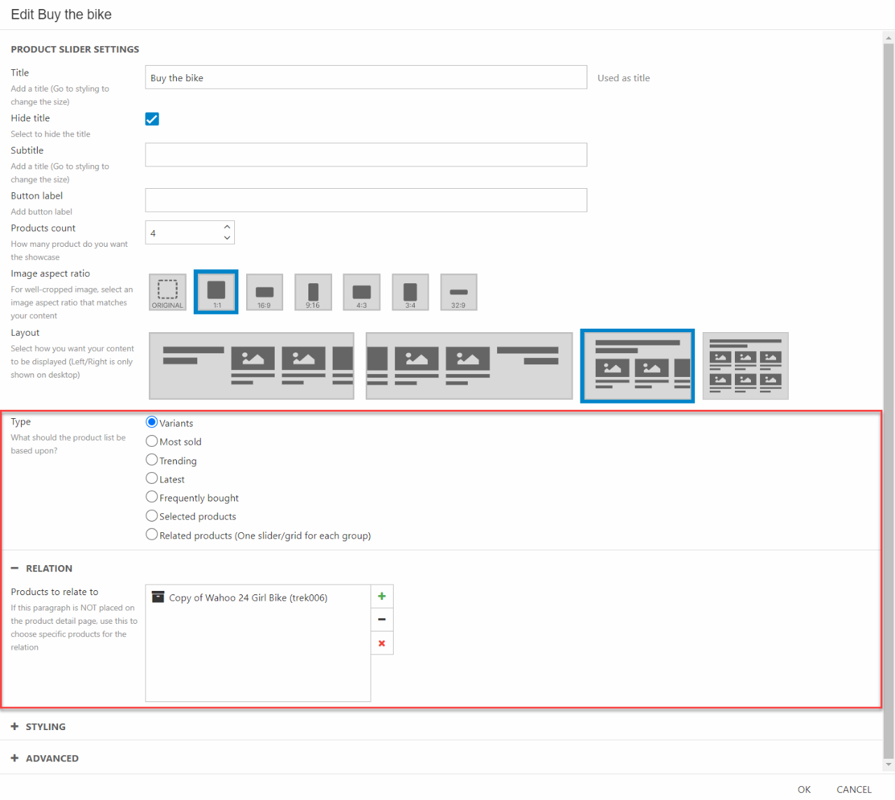 Again, to break the article into smaller pieces, we’ve placed a product slider. Depending on what kind of user story you’re writing you can pick what products to display. If it’s a story about a specific product, like a mountain bike, you could choose to display variants of the same bike (color, sizes, etc). Besides variants you can choose to display specifically selected products, related products or products based on criteria such as most sold, trending, latest, and frequently bought. In this example we’ve displayed variants of the bike used in the story. To do that, you have to toggle Variants in the “Type” section and choose the product to show variants of in the “Relation” section (Figure 14.3).