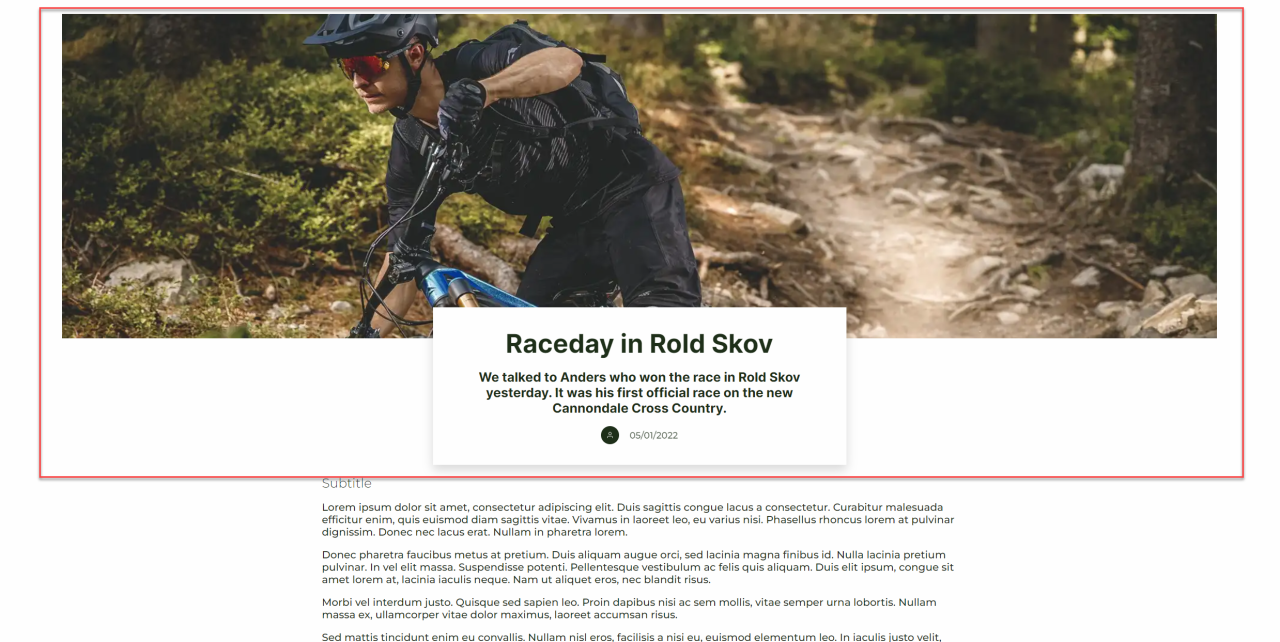 The article header is created for the article page type. It automatically renders image and texts from the article it is placed on. This means that the meta information written about the article when creating it will automatically be displayed on the article header. You can read more about our article concept here.