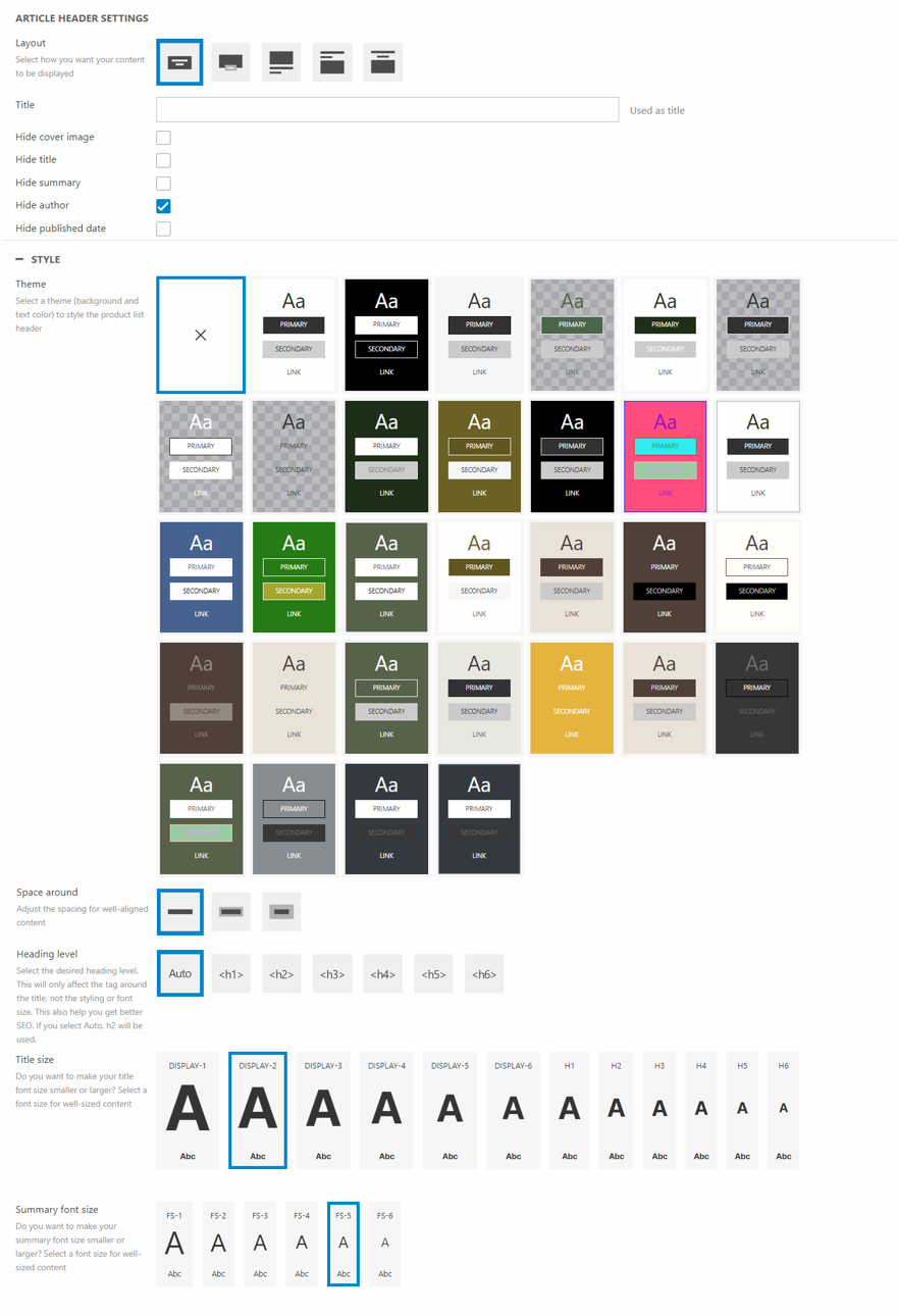 - Choose the heading level of the tag around the title. This will help on your SEO. You can read more about this in our SEO documentation