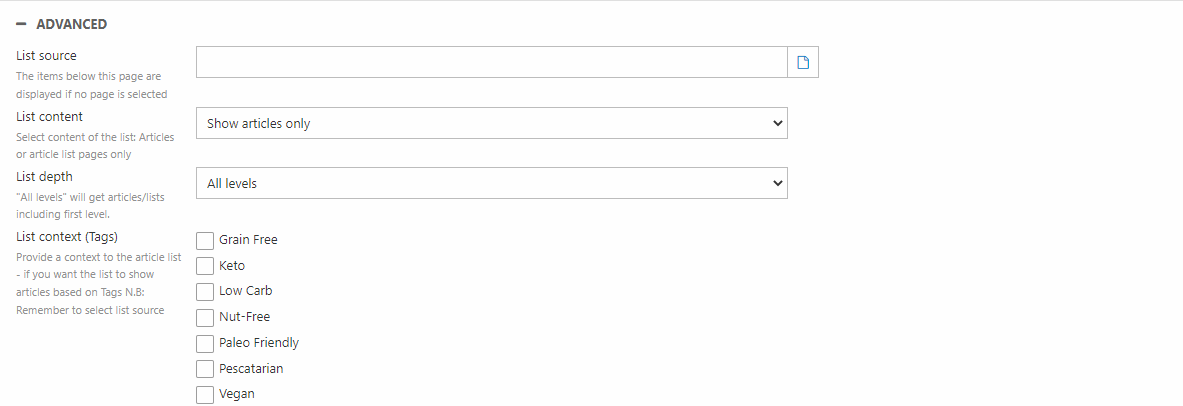In this case you choose "Recipes" as the List source. As we want the article list to contain related articles based on the tag "Egg" across the categories, we make sure to set the List depth to "All levels".