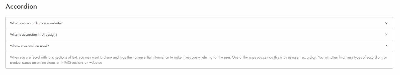 Accordion is often used when making a FAQ site. This allows you to structure a big piece of text by dividing it into pieces with suiting headers. This will make it less confusing for the reader.