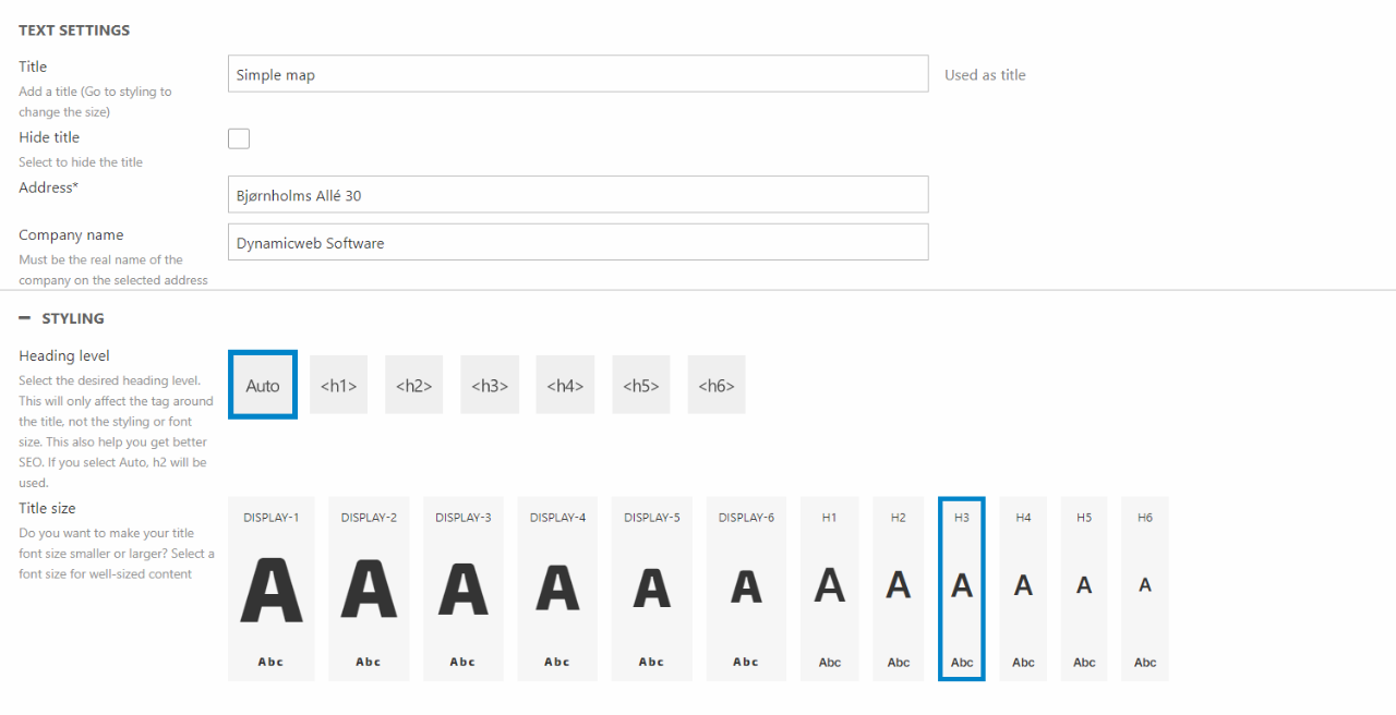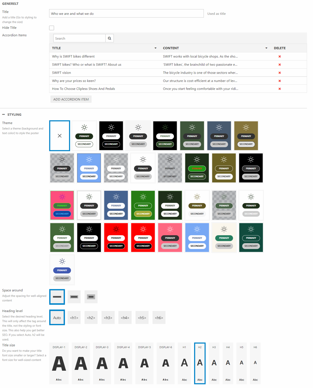 - Choose the heading level of the tag around the title. This will help on your SEO. You can read more about this in our SEO documentation.