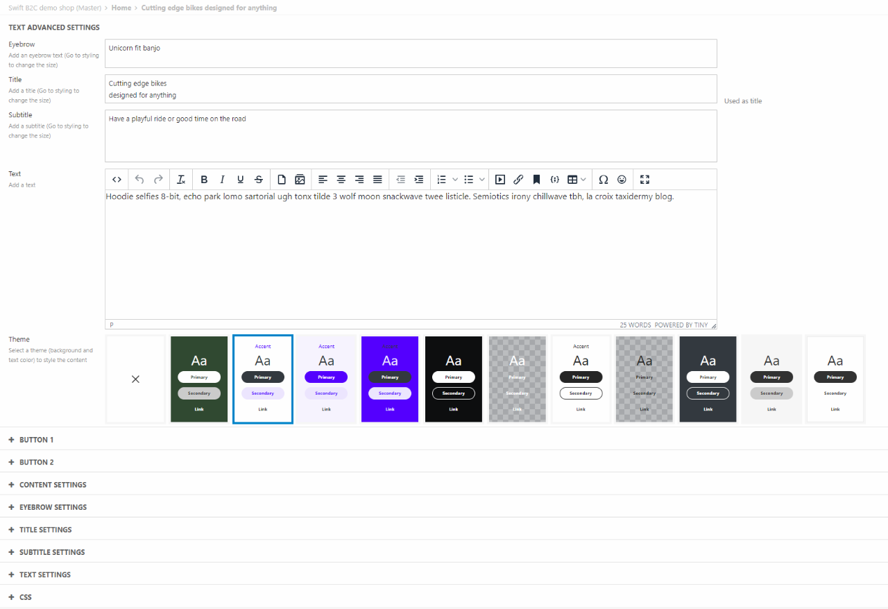 The eyebrow, title, subtitle, and text settings are similar. In these sections you can: