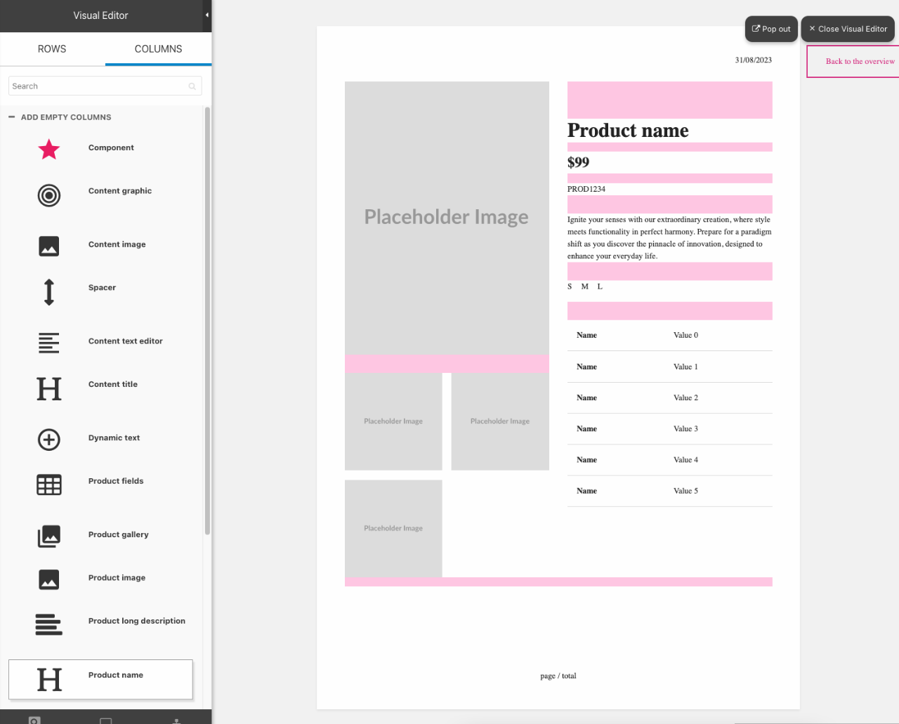 The layout folder is where you place the header and footer of the catalog. Headers and footers are often small watermarks that will create a connection between the different pages. This could also be page numbers. As you often want to keep the design of headers and footers relatively simple, you only have a few options in terms of content columns: Content Image, Content title, Date stamp, Page number and Page title.
