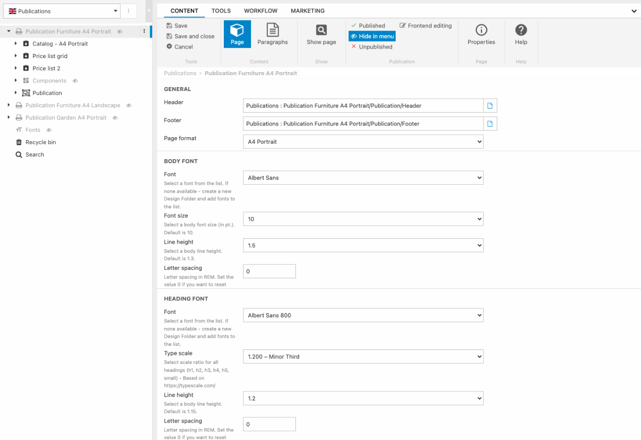 Publication is a tool to set up designs for printable catalogs containing content pages, data sheets, price lists based on already existing product information from DynamicWeb.