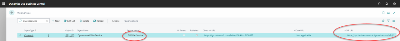 Once you have installed Dynamicweb connector service in BC, the Dynamicweb web service will be available in your Business Central application. Go to Web Services and search for "DWWebService" to locate it's URL.